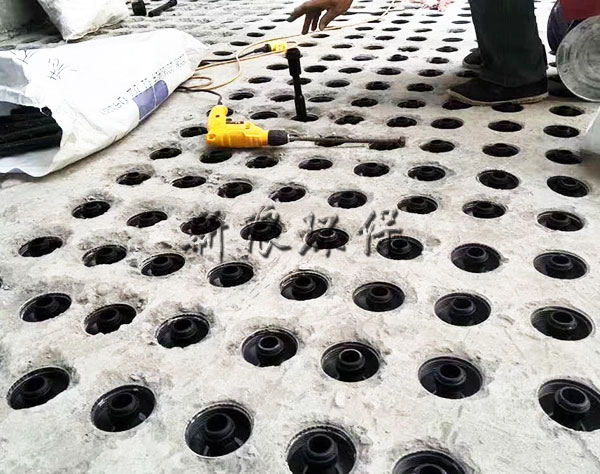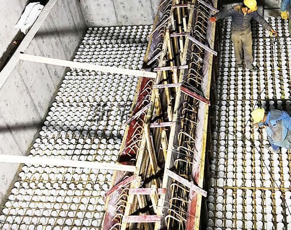 這是因為整體澆筑ABS濾板立體綁扎鋼筋和池壁的預埋鋼筋左右能成網(wǎng)狀結(jié)構(gòu)和濾梁的預埋鋼筋上下形成立體結(jié)構(gòu),極大的提高了濾板整體荷載力和抗沖擊力。這是小塊預制濾板的預埋螺栓無法實現(xiàn)的。在曝氣生物濾池中濾料層的填充高度往往高達4m,因此荷載要高于給水中的濾池。