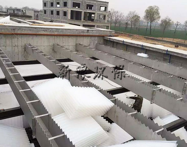 齒形集水槽(三角堰板式)兩側采用齒形堰板與槽體側板拼裝而成,拼裝孔為囊性具有可調(diào)性,堰齒角度為90度,